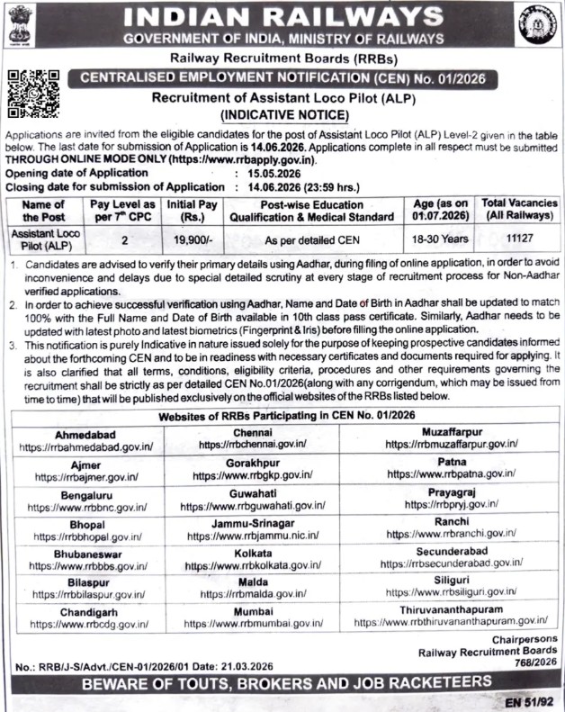 अगर आप सरकारी नौकरी की तलाश में हैं और रेलवे में काम करने का सपना देख रहे हैं, तो यह खबर आपके लिए किसी खुशखबरी से कम नहीं है। Indian Railways ने एक बार फिर बड़ी भर्ती का ऐलान किया है। Railway Recruitment Boards (RRBs) ने Centralised Employment Notification (CEN) No. 01/2026 के तहत Assistant Loco Pilot (ALP) के कुल 11,127 पदों पर भर्ती के लिए Indicative Notice जारी किया है।